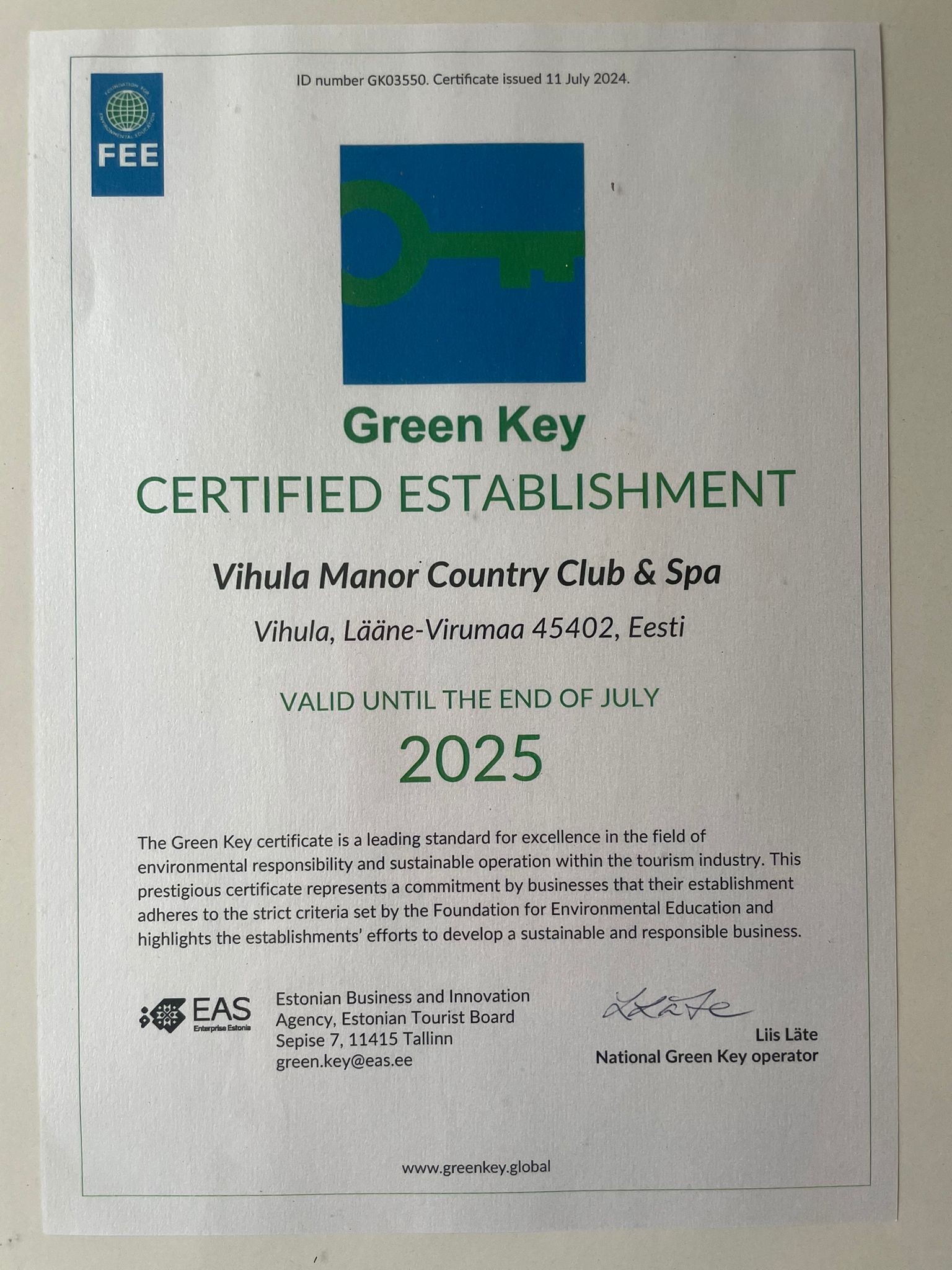 Vihula Mõisal on Rohelise Võtme keskkonnamärgis, mis kinnitab, et meie igapäevatöö järgib rahvusvahelisi kestlikkuse standardeid.